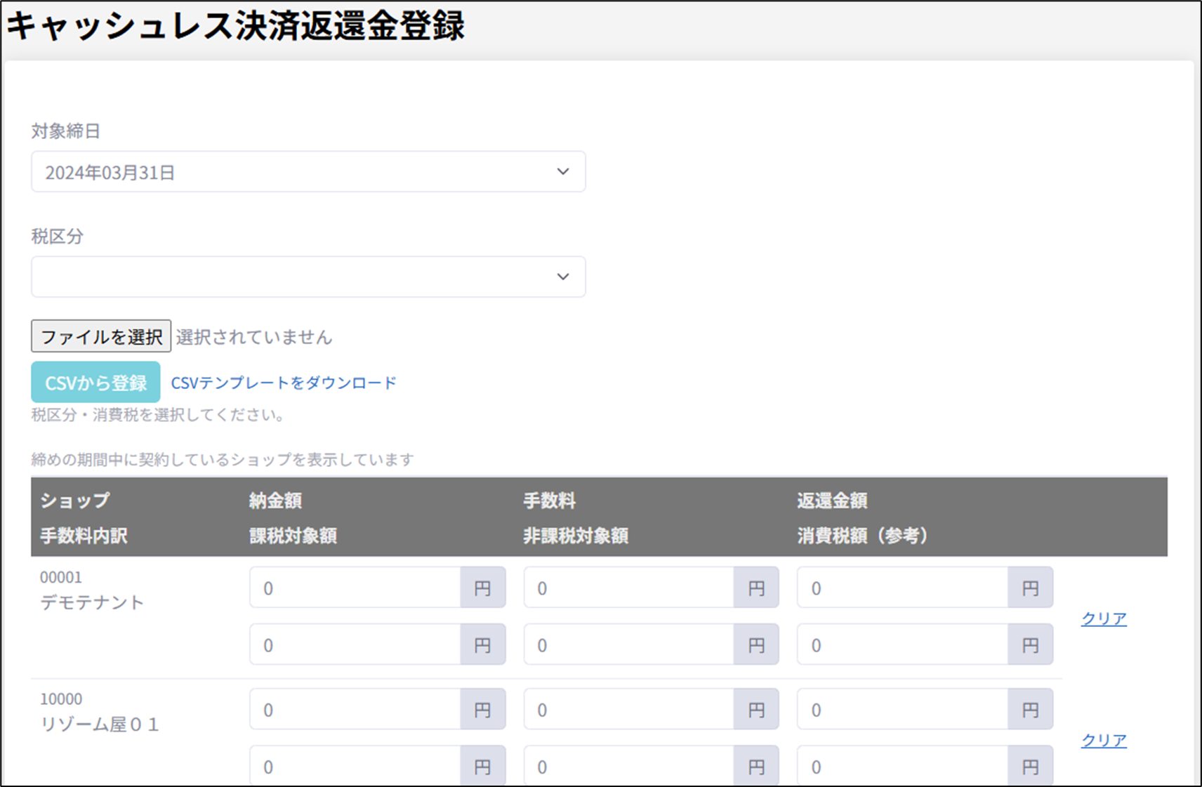 キャッシュレス決済代行業者より受領する明細をもとに ショップ別に決済金額・手数料を登録します。