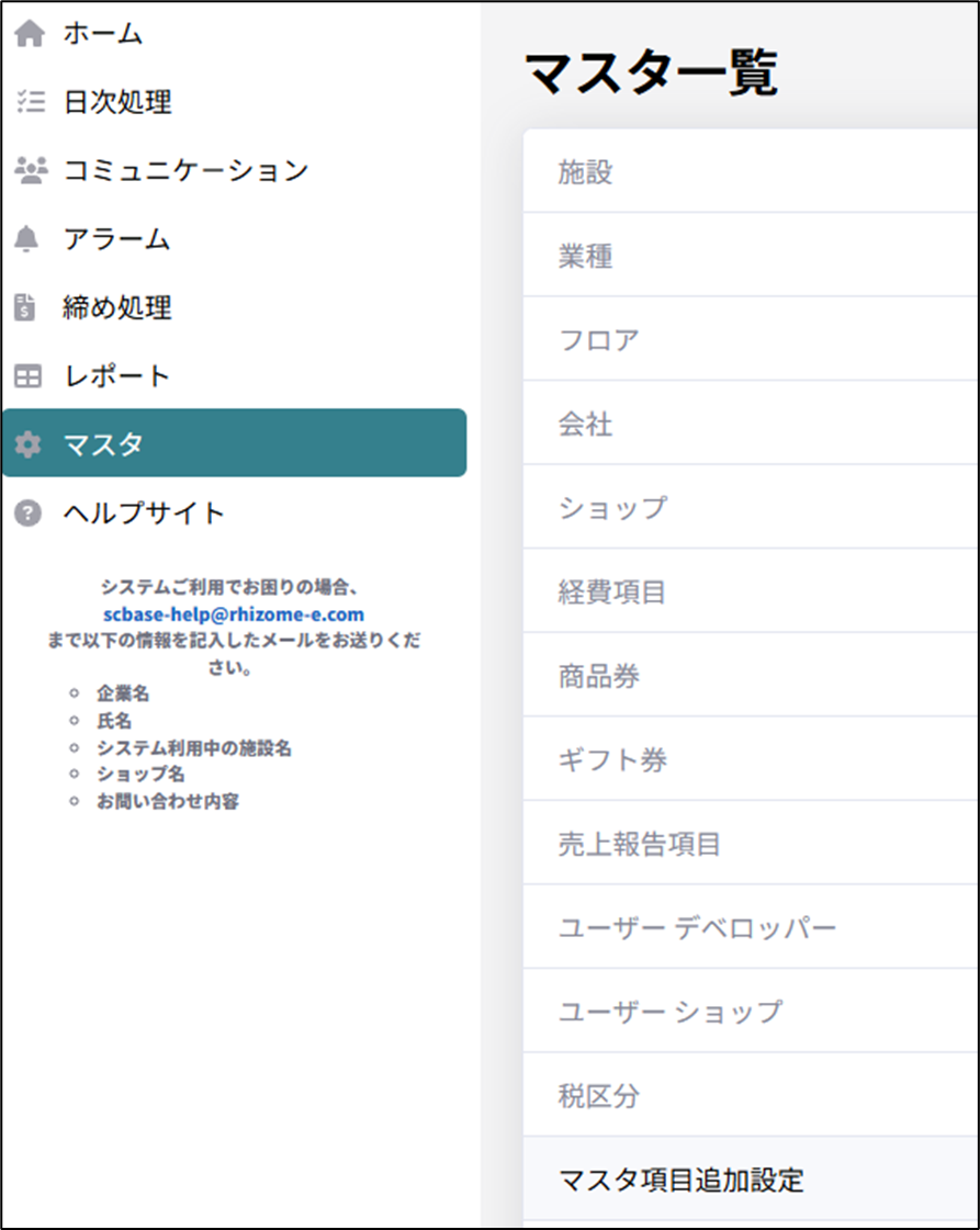 施設マスタ、ショップマスタ、経費項目マスタ、会社マスタに任意のユーザ定義項目を追加することが可能です。