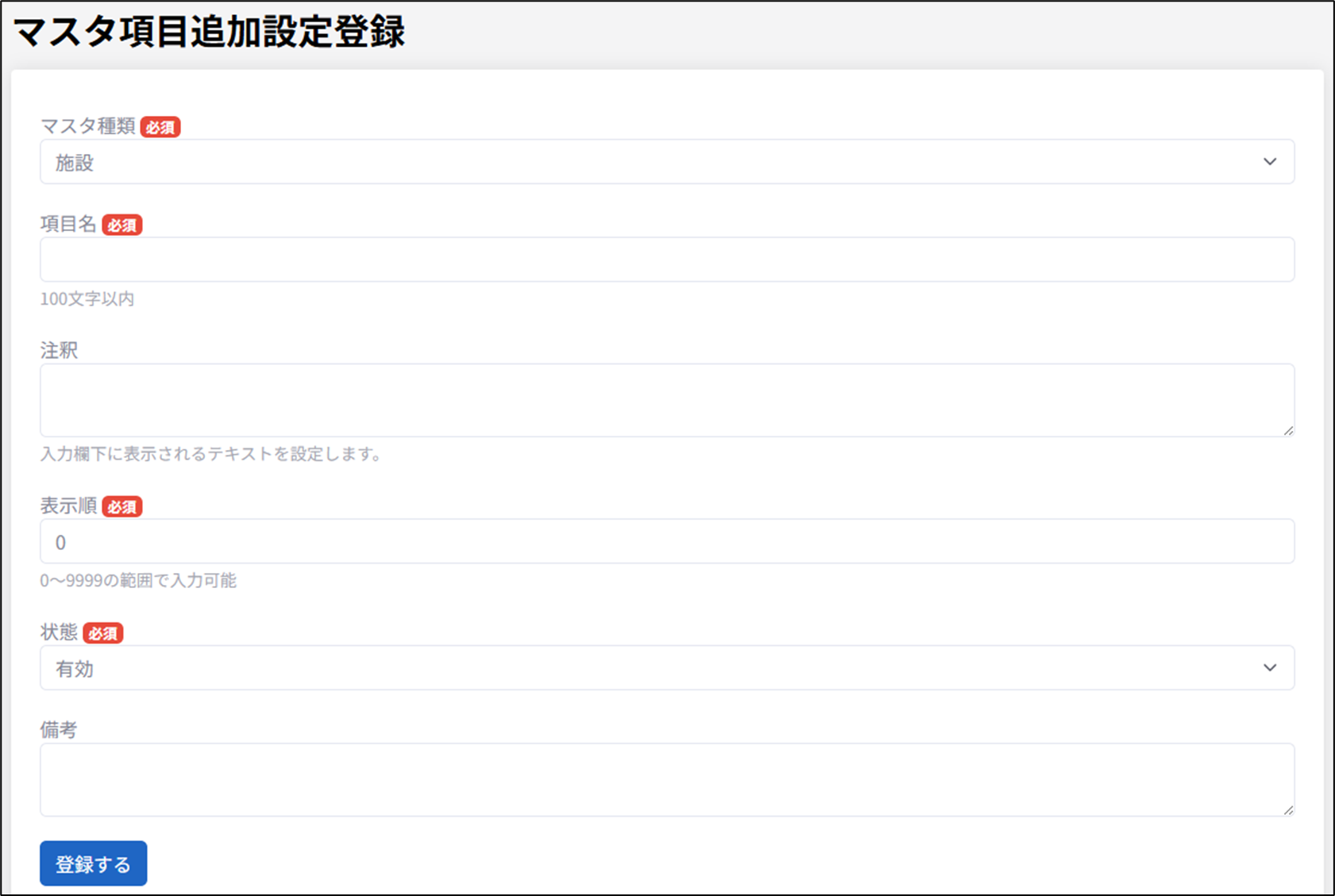 ③マスタ項目追加設定登録画面からマスタ種類を選択し、入力の上、「登録」をクリックします。
