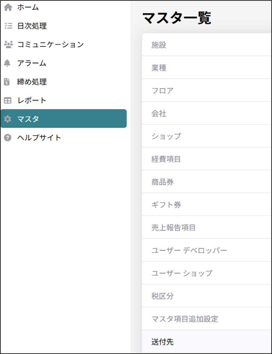 ①「MENU」-「マスタ」「送付先」をクリックします。